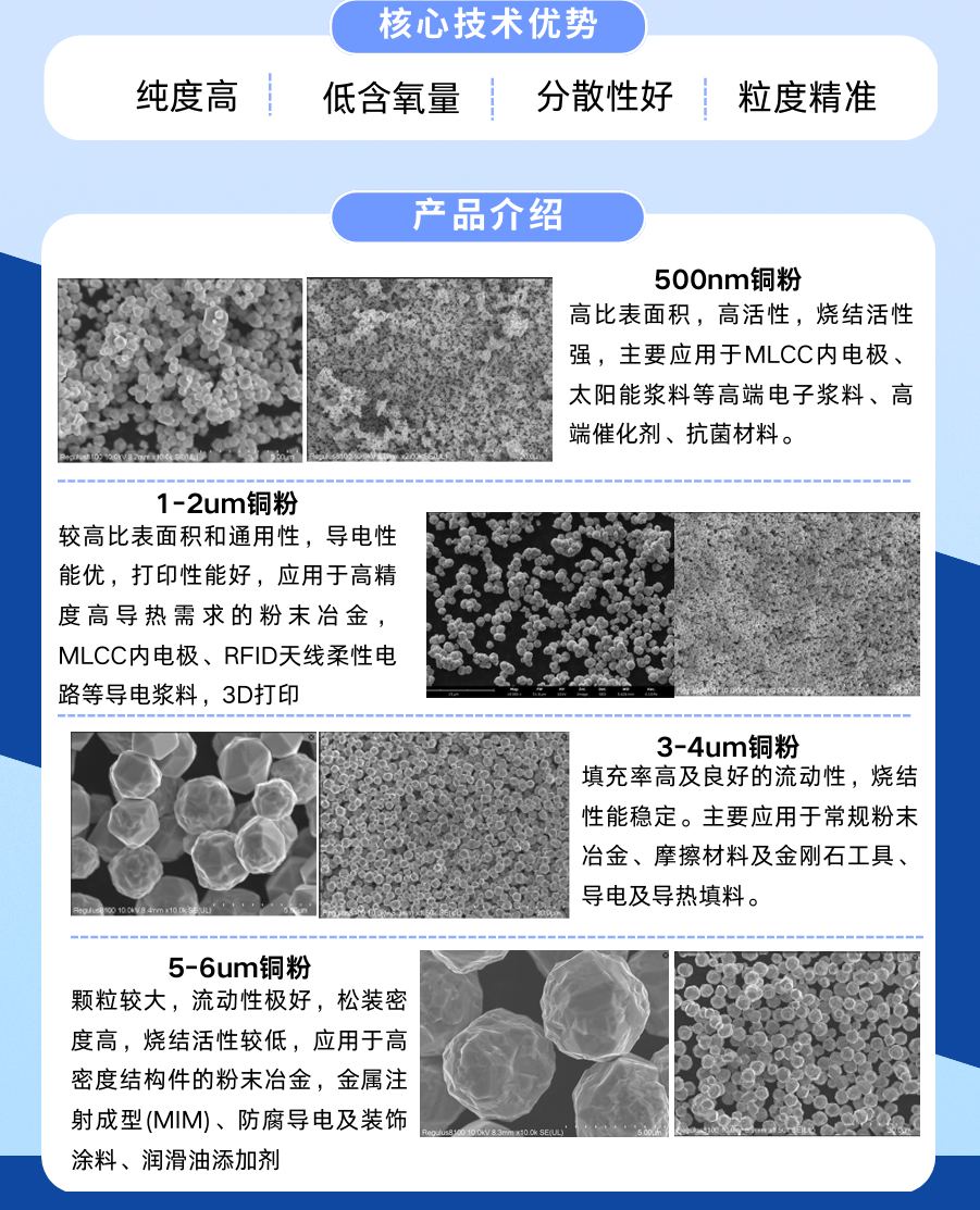 表面光洁:球形、类球形铜粉的表面光滑,无裂纹、无孔洞,这有助于提高产品的导电性能和机械性能。